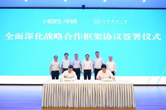 7月16日,河鋼與北京科技大學(以下簡稱北科大)全麵深化戰略合作框架協議簽署儀式在河鋼研發中心舉行,雙方深入貫徹落實國家創新驅動發展戰略,在科研開發、成果轉化、平台建設、人才培養等方麵開展務實合作,打造雙贏可持續發展的戰略合作夥伴關係,共同推進鋼鐵行業高端化、智能化、綠色化發展。河鋼集團黨委書記、董事長於勇與北科大黨委書記武貴龍圍繞全麵深化校企戰略合作進行了深入交流,並見證簽約。