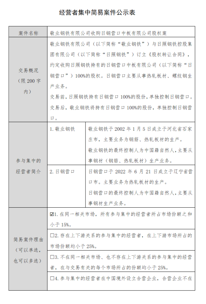 7月16日,北京市市場監督管理局發布了《敬業鋼鐵有限公司收購日鋼營口中板有限公司股權案》的案件公示。該公示中提到,敬業鋼鐵有限公司與日照鋼鐵控股集團有限公司訂立《股權轉讓合同》,約定收購日照鋼鐵持有的日鋼營口中板有限公司(以下簡稱“日鋼營口”)100%的股權。交易後,敬業鋼鐵將持有日鋼營口100%的股份,單獨控製日鋼營口。