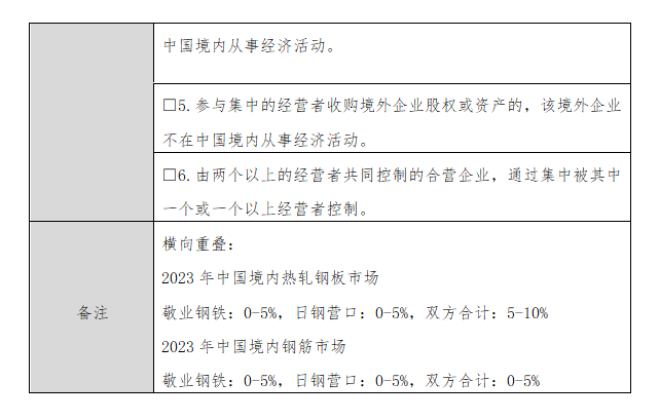 敬業鋼鐵有限公司(以下簡稱“敬業鋼鐵”)與日照鋼鐵控股集團有限公司(以下簡稱“日照鋼鐵”)訂立《股權轉讓合同》,約定收購日照鋼鐵持有的日鋼營口中板有限公司(以下簡稱“日鋼營口”)100%的股權。日鋼營口主要從事熱軋板材、螺紋鋼生產業務。交易前,日照鋼鐵持有日鋼營口100%的股份,單獨控製日鋼營口。交易後,敬業鋼鐵將持有日鋼營口100%的股份,單獨控製日鋼營口。