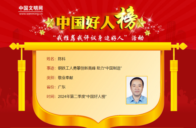 7月30日,2024年第二季度“中國好人榜”發布儀式暨全國道德模範與身邊好人現場交流活動在山西省大同市舉辦。經各地推薦、網友評議和專家評審等環節,共有153人(組)助人為樂、見義勇為、誠實守信、敬業奉獻、孝老愛親身邊好人光榮上榜。寶武集團中南股份陳科位列其中(“敬業奉獻”類)。