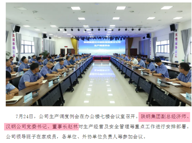 7月24日,陝鋼集團漢鋼公司發布的信息顯示,漢鋼公司生產調度例會在辦公樓七樓會議室召開。陝鋼集團副總經濟師、漢鋼公司黨委書記、董事長趙林對生產經營及安全管理等重點工作進行安排部署。
