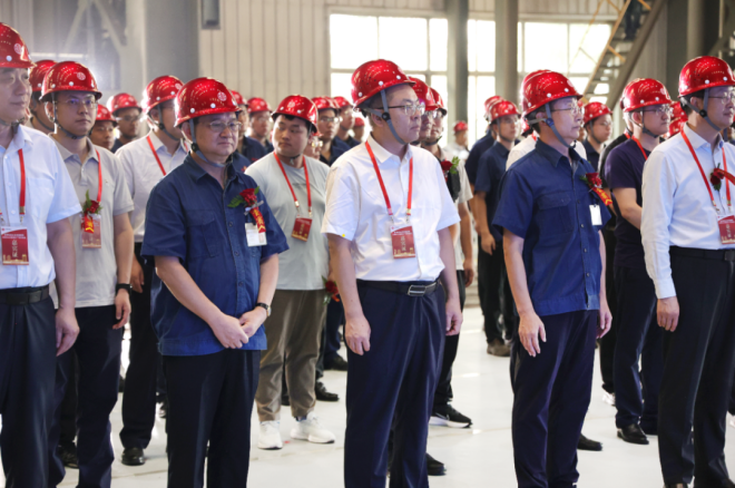 中冶京誠黨委委員、副總經理郝勇兵與中信重工黨委書記、董事長武漢琦,河南鋼鐵集團黨委書記、董事長薄學斌,共同為5600mm軋機工廠交付剪彩。