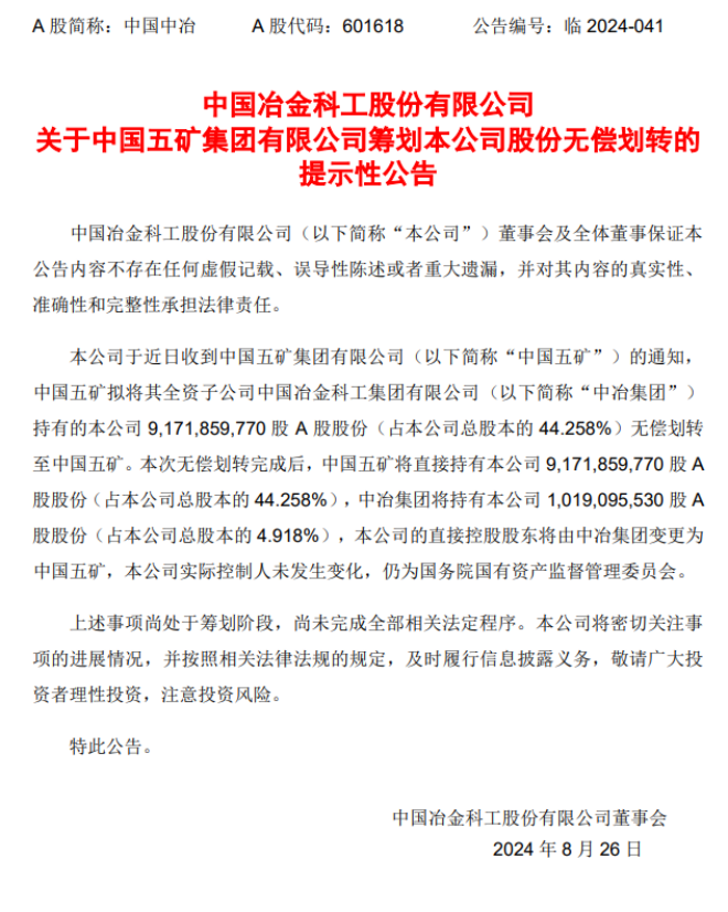 8月27日,中國中冶發布了《中國中冶關於中國五礦集團有限公司籌劃本公司股份無償劃轉的提示性公告》(以下簡稱《公告》)。