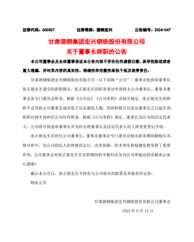 從《公告一》中zhong獲huo悉xi,甘gan肅su酒jiu鋼gang集ji團tuan宏hong興xing鋼gang鐵tie股gu份fen有you限xian公gong司si董dong事shi會hui收shou到dao原yuan董dong事shi長chang張zhang正zheng展zhan先xian生sheng遞di交jiao的de辭ci職zhi報bao告gao,張zhang正zheng展zhan先xian生sheng因yin職zhi務wu變bian動dong申shen請qing辭ci去qu公gong司si董dong事shi長chang、董事及董事會各專門委員會職務。