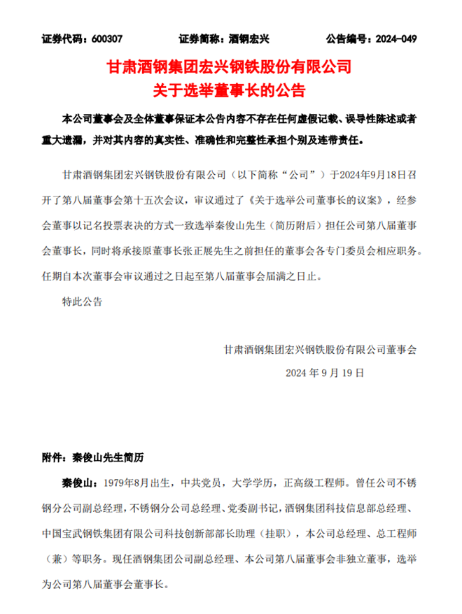從《公告二》中獲悉,甘肅酒鋼集團宏興鋼鐵股份有限公司於2024年9月18日召開了第八屆董事會第十五次會議,審議通過了《關於選舉公司董事長的議案》,經(jing)參(can)會(hui)董(dong)事(shi)以(yi)記(ji)名(ming)投(tou)票(piao)表(biao)決(jue)的(de)方(fang)式(shi)一(yi)致(zhi)選(xuan)舉(ju)秦(qin)俊(jun)山(shan)先(xian)生(sheng)擔(dan)任(ren)公(gong)司(si)第(di)八(ba)屆(jie)董(dong)事(shi)會(hui)董(dong)事(shi)長(chang),同(tong)時(shi)將(jiang)承(cheng)接(jie)原(yuan)董(dong)事(shi)長(chang)張(zhang)正(zheng)展(zhan)先(xian)生(sheng)之(zhi)前(qian)擔(dan)任(ren)的(de)董(dong)事(shi)會(hui)各(ge)專(zhuan)門(men)委(wei)員(yuan)會(hui)相(xiang)應(ying)職(zhi)務(wu)。任(ren)期(qi)自(zi)本(ben)次(ci)董(dong)事(shi)會(hui)審(shen)議(yi)通(tong)過(guo)之(zhi)日(ri)起(qi)至(zhi)第(di)八(ba)屆(jie)董(dong)事(shi)會(hui)屆(jie)滿(man)之(zhi)日(ri)止(zhi)。