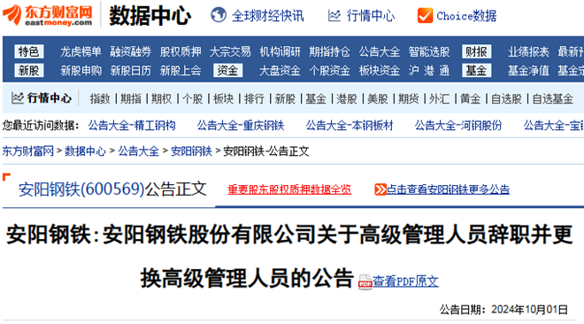 10月1日,安陽鋼鐵(600569)發布了《安陽鋼鐵股份有限公司關於高級管理人員辭職並更換高級管理人員的公告》與《安陽鋼鐵股份有限公司關於職工董事辭職並更換職工董事的公告》。