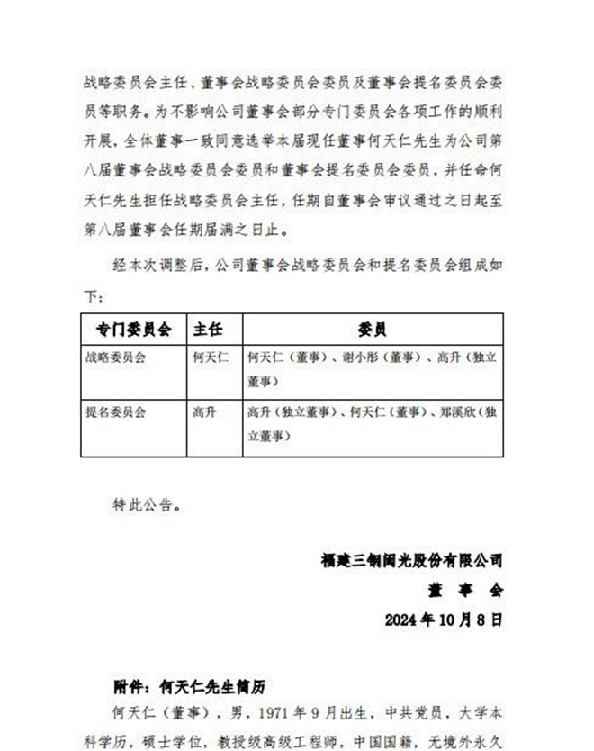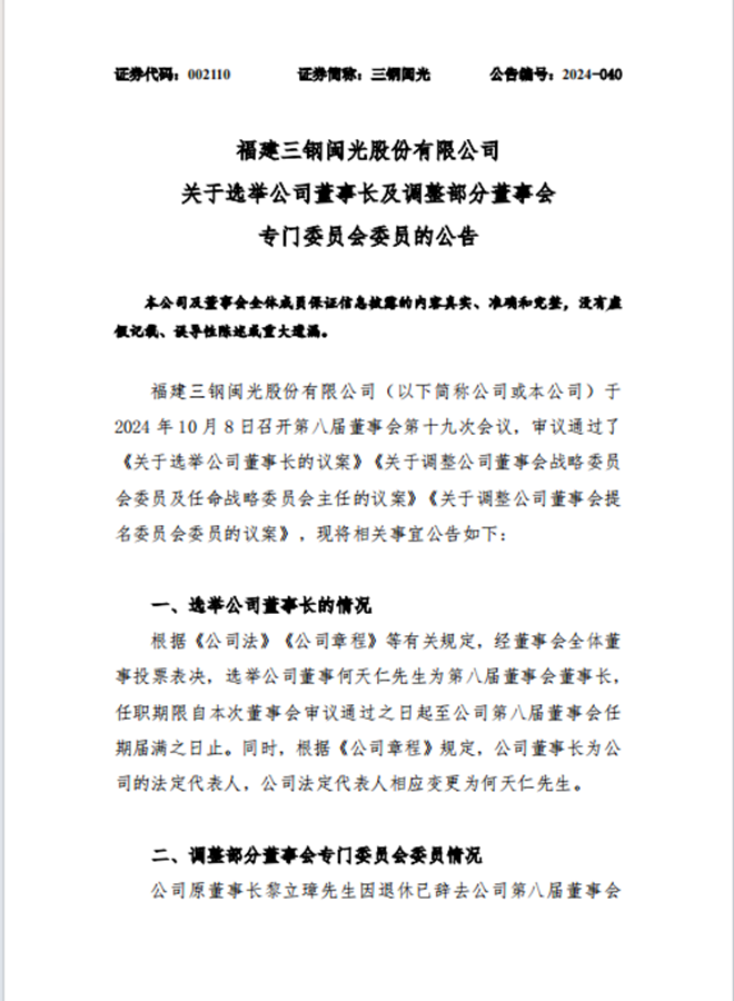 10月9日,福建三鋼閩光股份有限公司發布公告稱,於 2024 年 10 月 8 日召開第八屆董事會第十九次會議,審議通過了 《關於選舉公司董事長的議案》《關於調整公司董事會戰略委員會委員及任命戰略委員會主任的議案》《關於調整公司董事會提名委員會委員的議案》。