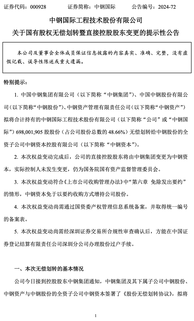 中鋼國際工程技術股份有限公司(000928)(以下簡稱“公司”)於10月10日晚間發布《關於國有股權無償劃轉暨直接控股股東變更的提示性公告》(以下簡稱《公告》),公司控股股東中國中鋼集團有限公司及其下屬子公司中國中鋼股份有限公司、中鋼資產管理有限責任公司擬將合計持有的公司6.98億股股份(占中鋼國際股份總數的48.66%)無償劃轉給中鋼股份的全資子公司中鋼資本控股有限公司。