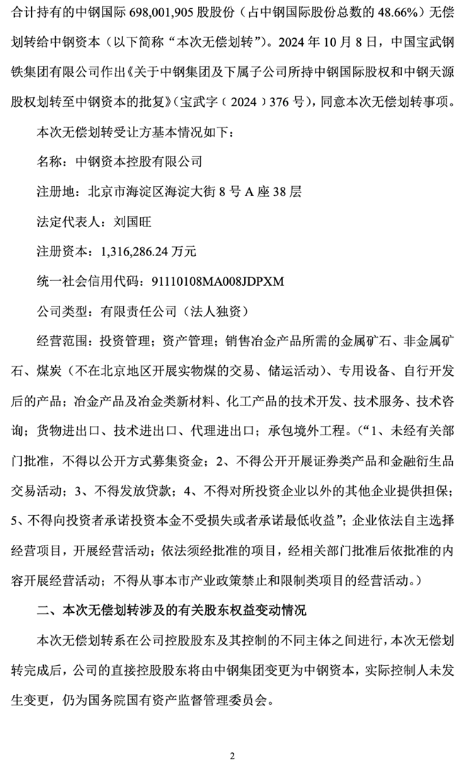 10月8日,公司間接控股股東中國寶武鋼鐵集團有限公司作出《關於中鋼集團及下屬子公司所持中鋼國際股權和中鋼天源股權劃轉至中鋼資本的批複》,同意本次無償劃轉事項。
