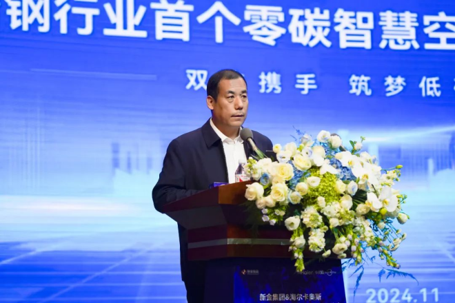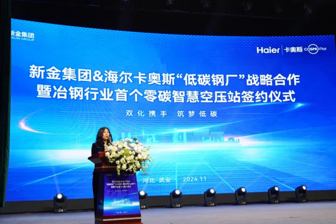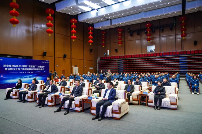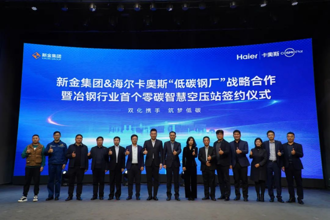 11月23日上午,新金集團與海爾卡奧斯“低碳鋼廠”戰略合作暨冶鋼行業首個零碳智慧空壓站簽約儀式在新金集團大禮堂舉行。