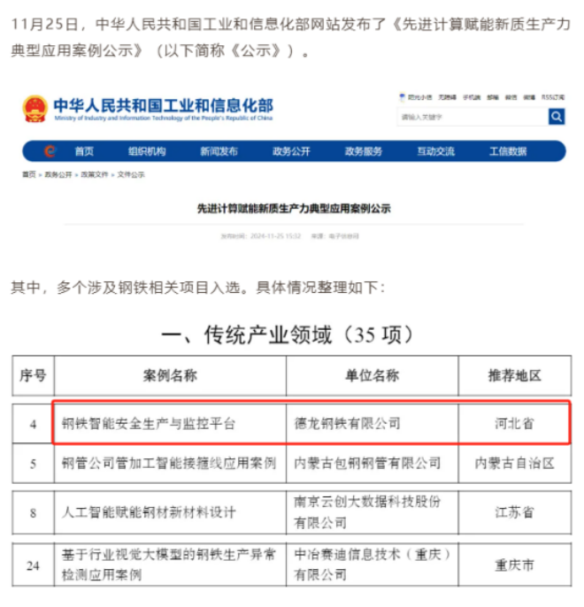 德龍鋼鐵入選2024年工信部先進計算賦能新質生產力典型應用案例
