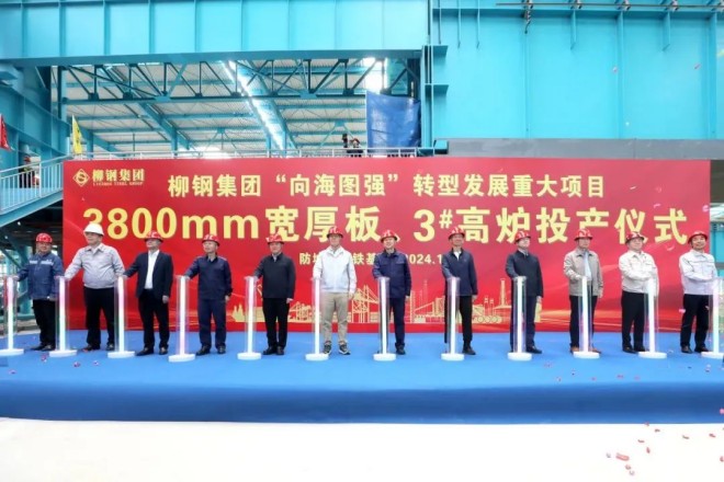11月26日,柳鋼集團舉行“向海圖強”轉型發展重大項目——防城港鋼鐵基地3800mm寬厚板、3號高爐投產儀式。標誌著柳鋼集團“高端化、智能化、綠色化”轉型發展取得重大突破,填補了廣西寬厚板產品生產空白,防城港千萬噸級鋼鐵基地(一期)全麵建成,為全區工業振興注入強大鋼鐵動能。