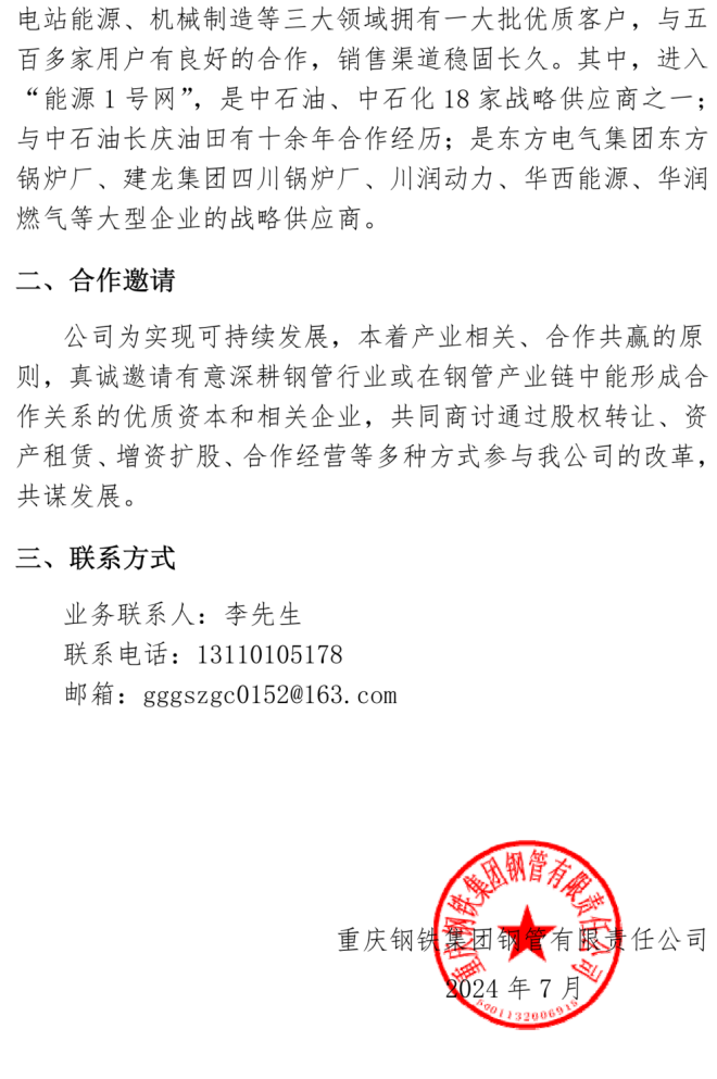 重慶鋼鐵集團鋼管有限責任公司合作邀請書