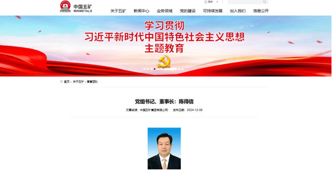 2024年12月6日(ri)上(shang)午(wu),中(zhong)國(guo)五(wu)礦(kuang)集(ji)團(tuan)有(you)限(xian)公(gong)司(si)召(zhao)開(kai)中(zhong)層(ceng)以(yi)上(shang)管(guan)理(li)人(ren)員(yuan)大(da)會(hui)。中(zhong)央(yang)組(zu)織(zhi)部(bu)有(you)關(guan)負(fu)責(ze)同(tong)誌(zhi)宣(xuan)布(bu)了(le)黨(dang)中(zhong)央(yang)關(guan)於(yu)中(zhong)國(guo)五(wu)礦(kuang)集(ji)團(tuan)有(you)限(xian)公(gong)司(si)主(zhu)要(yao)負(fu)責(ze)同(tong)誌(zhi)調(tiao)整(zheng)的(de)決(jue)定(ding):陳得信同誌任中國五礦集團有限公司董事長、黨組書記,免去其中國五礦集團有限公司總經理職務。相關職務任免,按有關法律和章程的規定辦理。
