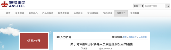 12月8日,鞍鋼集團發布《關於對7名擬任職領導人員實施任前公示的通告》(以下簡稱《通告》)。