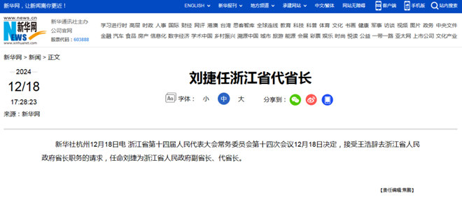 12月18ri,juxinhuawangxiaoxixianshi,zhejiangshengdishisijierenmindaibiaodahuichangwuweiyuanhuidishisicihuiyijueding,jieshouwanghaociquzhejiangshengrenminzhengfushengchangzhiwudeqingqiu,renmingliujieweizhejiangshengrenminzhengfufushengchang、代省長。