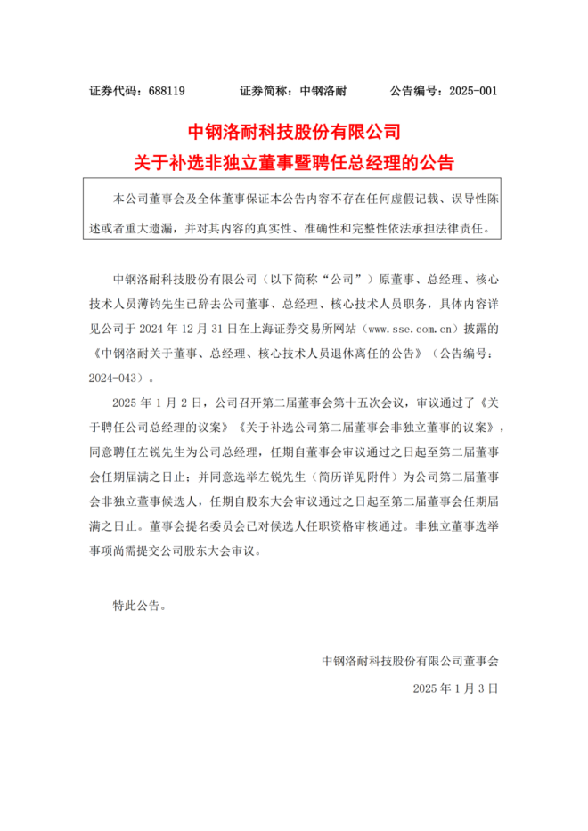 1月3日,中鋼洛耐發布《關於補選非獨立董事暨聘任總經理的公告》(以下簡稱《公告一》。