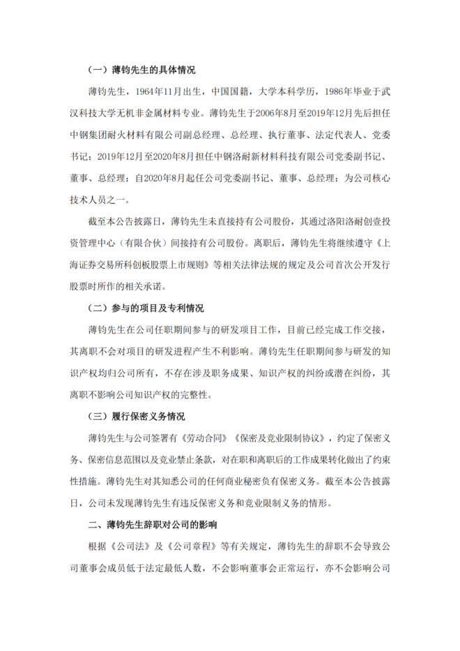 2024年12月31日,中鋼洛耐發布《關於董事、總經理、核心技術人員退休離任的公告》(以下簡稱《公告二》。