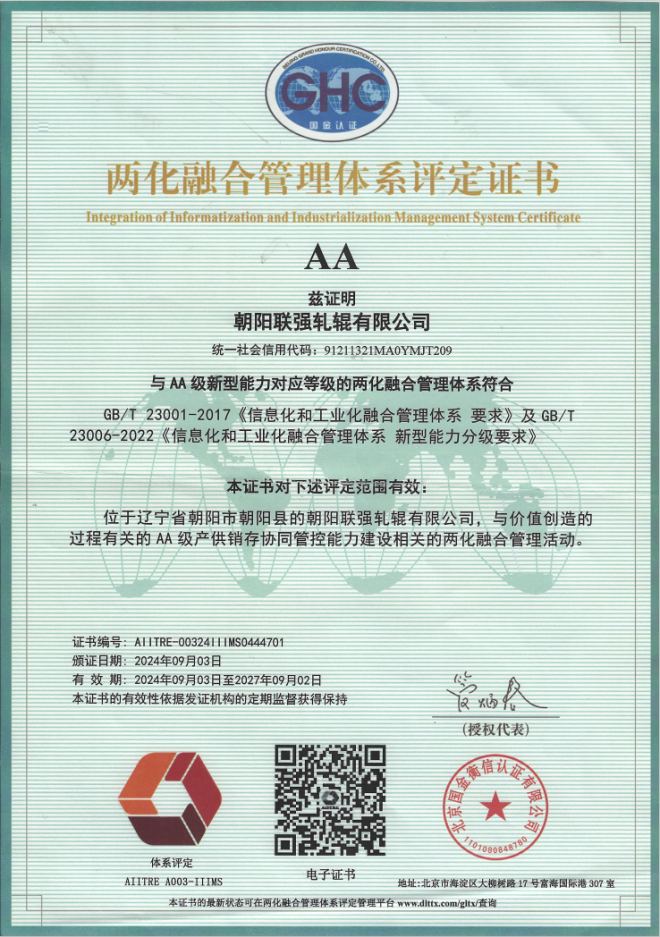 2024年9月2日,聯強軋輥更是成功獲得了兩化融合管理體係AA級ji認ren證zheng,標biao誌zhi著zhe公gong司si不bu僅jin在zai數shu字zi化hua工gong廠chang建jian設she上shang邁mai出chu堅jian實shi步bu伐fa,更geng在zai信xin息xi化hua與yu工gong業ye化hua深shen度du融rong合he方fang麵mian取qu得de了le重zhong大da突tu破po,為wei企qi業ye持chi續xu健jian康kang發fa展zhan奠dian定ding了le堅jian實shi基ji礎chu。