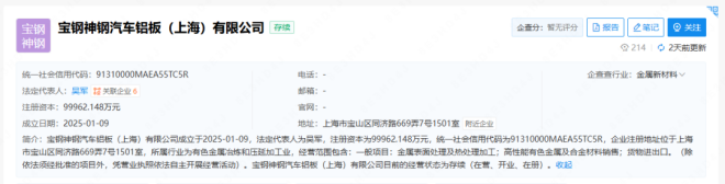從企查查獲悉,2025年1月9日,寶鋼神鋼汽車鋁板(上海)有限公司成立,法定代表人為吳軍,注冊資本約10億人民幣,經營範圍為金屬表麵處理及熱處理加工、高性能有色金屬及合金材料銷售、貨物進出口。