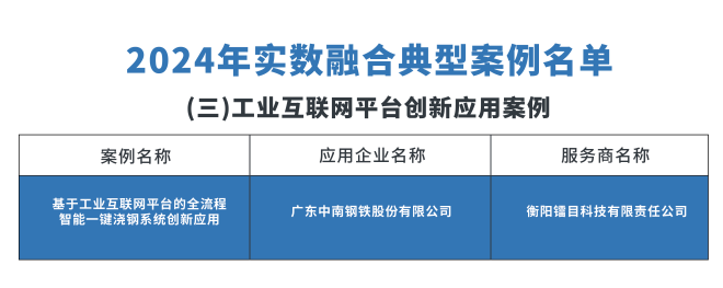 近日,工業和信息化部發布了關於2024年實數融合典型案例名單的公示。 鐳目科技潛心研發並應用於廣東中南鋼鐵股份有限公司(原韶關鋼鐵公司,下文簡稱中南鋼鐵)的“全流程智能一鍵澆鋼係統”成功入選“智能化製造”方向典型案例。