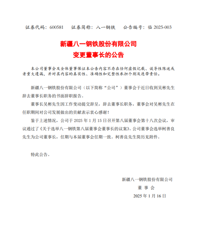 1月16日,新疆八一鋼鐵股份有限公司發布了《新疆八一鋼鐵股份有限公司 變更董事長的公告》以下簡稱《公告》。
