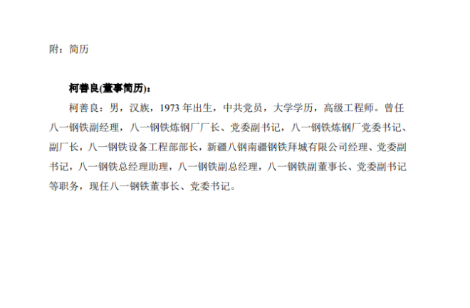 柯善良:男,漢族,1973 年出生,中共黨員,大學學曆,高級工程師。曾任 八一鋼鐵副經理,八一鋼鐵煉鋼廠廠長、黨委副書記,八一鋼鐵煉鋼廠黨委書記、 副廠長,八一鋼鐵設備工程部部長,新疆八鋼南疆鋼鐵拜城有限公司經理、黨委副 書記,八一鋼鐵總經理助理,八一鋼鐵副總經理,八一鋼鐵副董事長、黨委副書記 等職務,現任八一鋼鐵董事長、黨委書記。