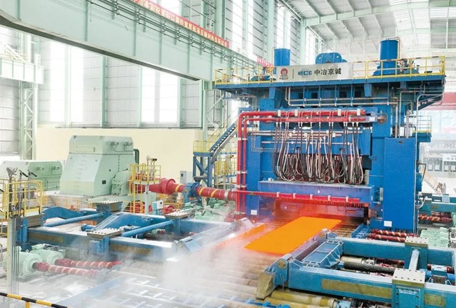 2024年10月31日,由中冶京誠工程技術有限公司(以下簡稱中冶京誠)自主設計供貨的全球最寬厚板軋機——周口鋼鐵5600毫米寬厚板粗軋機熱負荷試車,軋製出第一塊寬厚板,這是全球鋼鐵極限製造領域的又一次成功跨越,標誌著世界寬厚板軋機邁入5600毫米新時代。