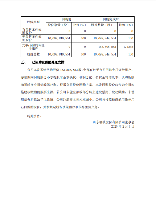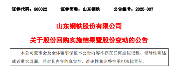 2月6日,山東鋼鐵發布了《山東鋼鐵股份有限公司關於股份回購實施結果暨股份變動的公告》(以下簡稱《公告》)。