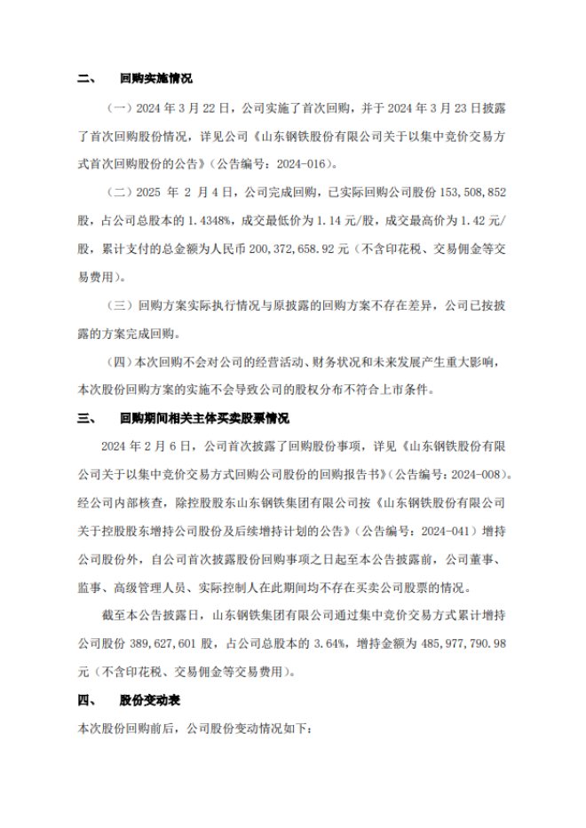 從《公告》中獲悉,山東鋼鐵股份有限公司於2024年2月5日召開第七屆董事會第三十二次會議審議通過回購股份議案,於2025年1月6日召開第八屆董事會第八次會議補充回購股份資金來源。2024年3月22日施行首次回購,2025年2月4日完成回購,實際回購公司股份1.54億股,占總股本的1.4348%,成交最低價為1.14元/股,最高價為1.42元/股,總金額為2億yi元yuan。回hui購gou期qi間jian除chu控kong股gu股gu東dong增zeng持chi外wai,董dong事shi等deng相xiang關guan主zhu體ti無wu買mai賣mai公gong司si股gu票piao的de情qing況kuang。本ben次ci回hui購gou股gu份fen存cun於yu專zhuan用yong賬zhang戶hu,將jiang用yong於yu股gu權quan激ji勵li,未wei用yong部bu分fen將jiang依yi法fa注zhu銷xiao。
