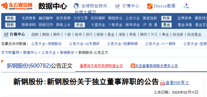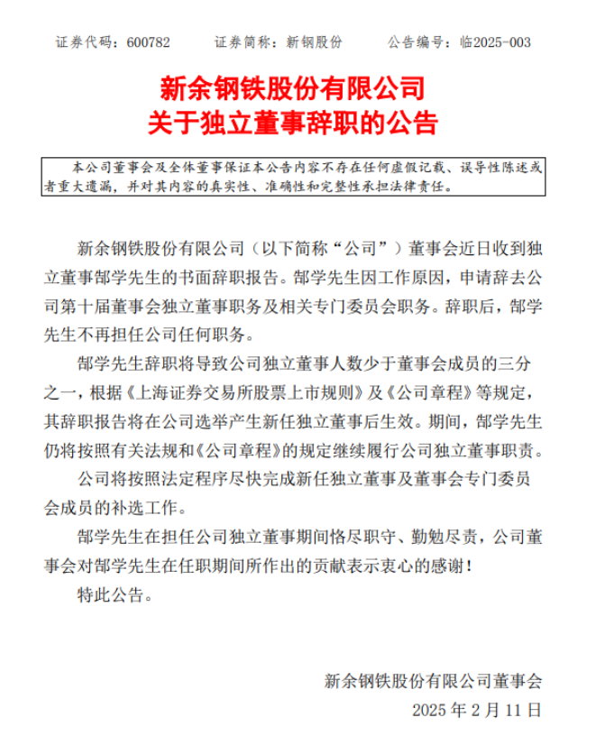 2月11日,新鋼股份發布了《新餘鋼鐵股份有限公司關於獨立董事辭職的公告》。