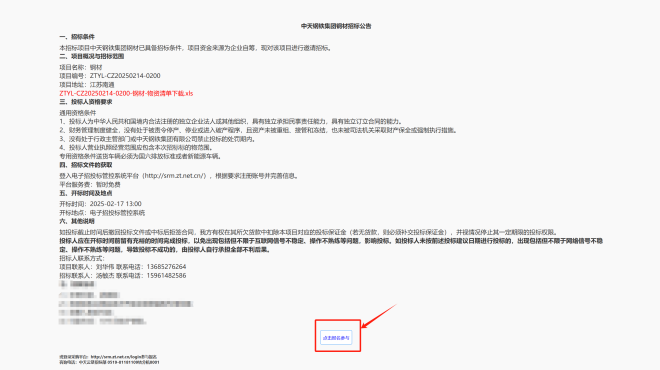 為了進一步提升廣大供應商的參與便捷度,集團不斷簡化“中天鋼鐵供應鏈管理平台”的操作流程。供應商通過瀏覽器訪問“http://srm.zt.net.cn/”網址,即可查看“采購公告欄”中(zhong)的(de)招(zhao)標(biao)項(xiang)目(mu)詳(xiang)情(qing),並(bing)自(zi)由(you)選(xuan)擇(ze)感(gan)興(xing)趣(qu)的(de)項(xiang)目(mu)報(bao)名(ming)。平(ping)台(tai)提(ti)供(gong)清(qing)晰(xi)的(de)報(bao)名(ming)提(ti)示(shi)和(he)操(cao)作(zuo)指(zhi)南(nan),以(yi)及(ji)一(yi)對(dui)一(yi)的(de)專(zhuan)業(ye)指(zhi)導(dao),幫(bang)助(zhu)新(xin)供(gong)應(ying)商(shang)快(kuai)速(su)熟(shu)悉(xi)流(liu)程(cheng),順(shun)利(li)開(kai)始(shi)合(he)作(zuo)。