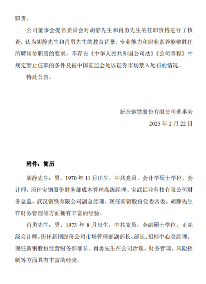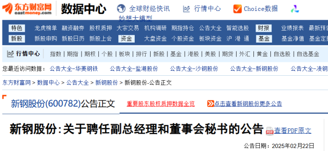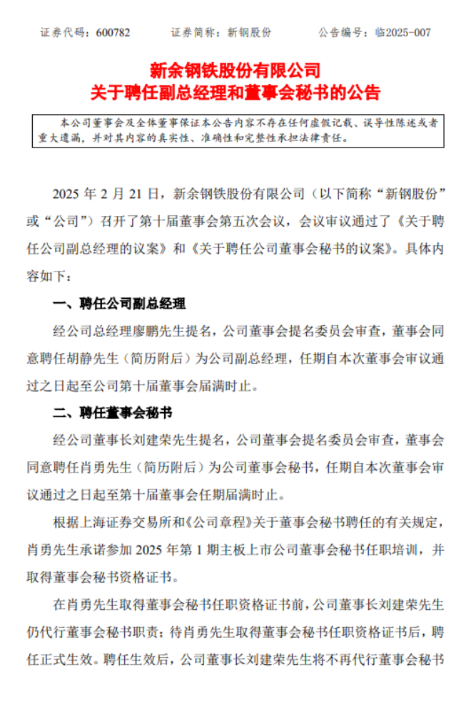2月22日,新鋼股份發布了《新餘鋼鐵股份有限公司關於聘任副總經理和董事會秘書的公告》(以下簡稱《公告》)。