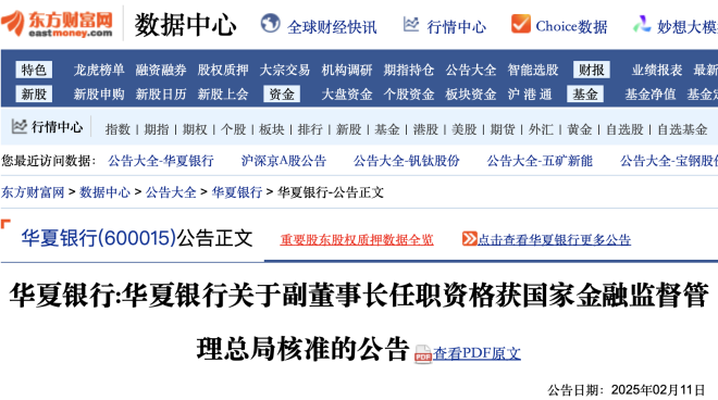 同期,2月11日,華夏銀行發布《關於副董事長任職資格獲國家金融監督管理總局核準的公告》。