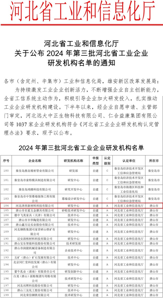 近日,河北省工業和信息化廳發布《關於公布2024年第三批河北省工業企業研發機構名單的通知》,津西新材料通過河北省工業企業研發機構A級認定,這標誌著津西新材料在裝配式建築、綠色鋼結構、固廢綜合利用等領域技術研發能力得到高度認可。