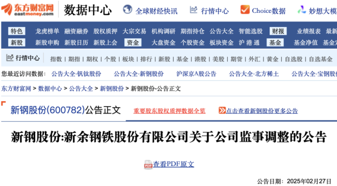 2月27日,新鋼股份發布《關於公司監事調整的公告》。