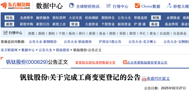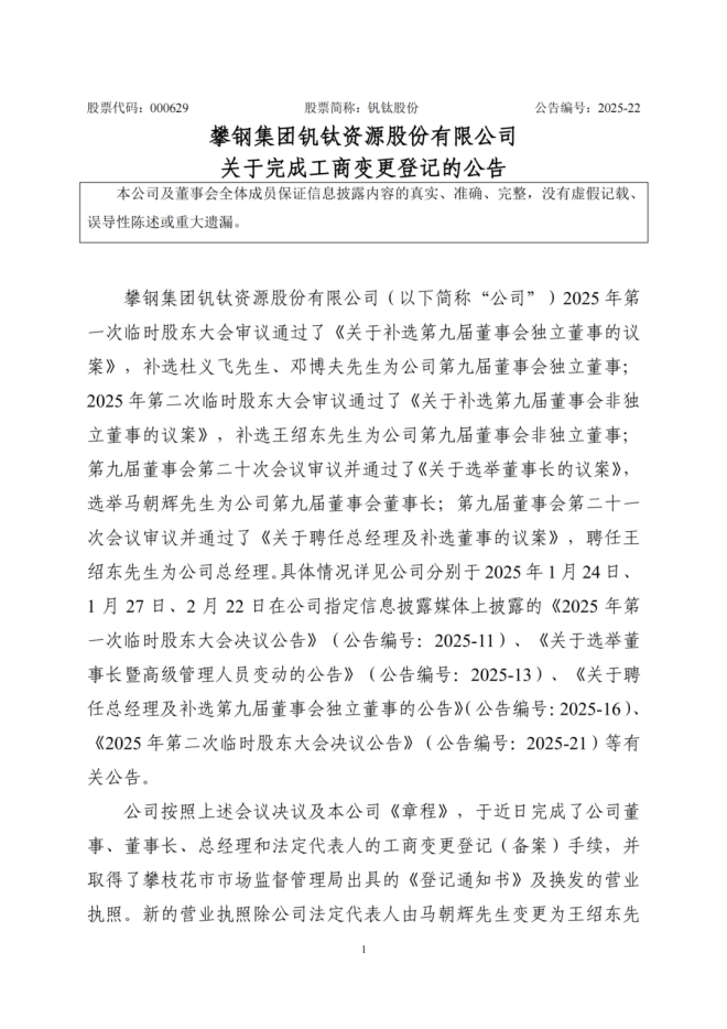 2月27日,釩鈦股份發布《關於完成工商變更登記的公告》。