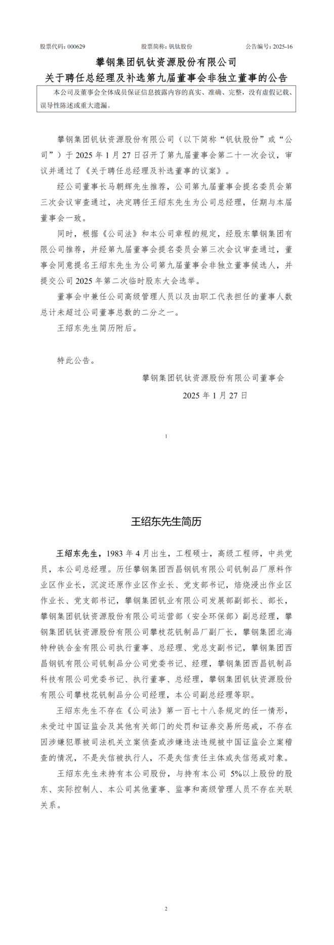 其中提到,攀鋼集團釩鈦資源股份有限公司(以下簡稱“公司”)2025 年第二次臨時股東大會審議通過了《關於補選第九屆董事會非獨立董事的議案》,補選王紹東先生為公司第九屆董事會非獨立董事;第九屆董事會第二十次會議審議並通過了《關於選舉董事長的議案》,選舉馬朝輝先生為公司第九屆董事會董事長;第九屆董事會第二十一次會議審議並通過了《關於聘任總經理及補選董事的議案》,聘任王紹東先生為公司總經理。 具體情況詳見公司有關公告。