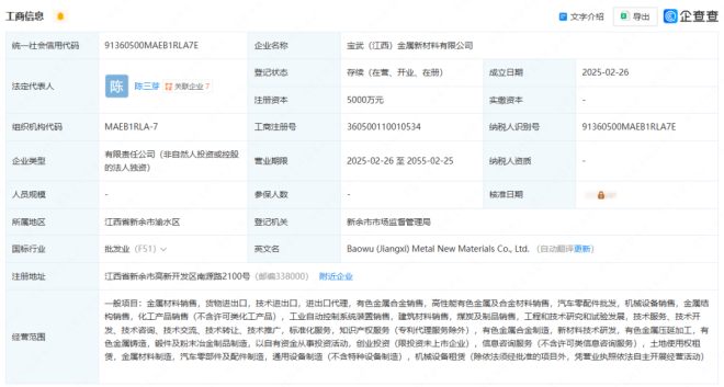 據企查查顯示,2025年2月26日,寶武(江西)金屬新材料有限公司成立,法定代表人為陳三芽,注冊資本為5000萬元,經營範圍包含:金屬材料銷售,貨物進出口,汽車零配件批發,機械設備銷售,金屬結構銷售,有色金屬合金製造,新材料技術研發等。