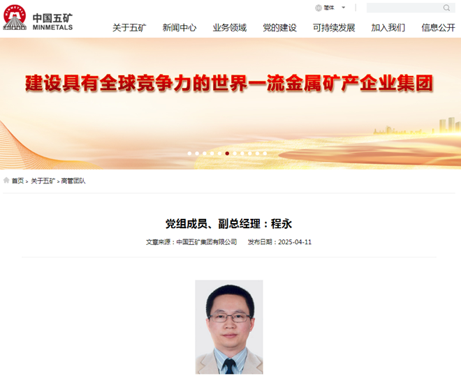 4月11日,中國五礦集團官網顯示,該集團高管團隊發生變動:程永已擔任中國五礦黨組成員、副總經理。