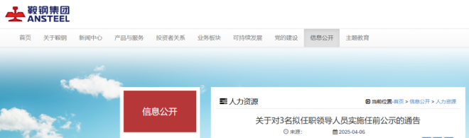 近日,鞍鋼集團官網發布了《關於對3名擬任職領導人員實施任前公示的通告》。