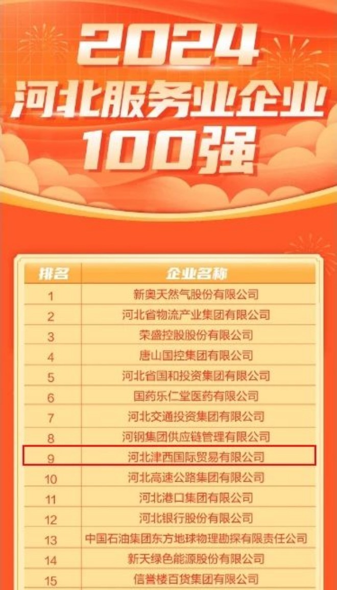近日,河北省企業聯合會發布了2024河北企業100強、製造業企業100強、服務業企業100強和創新領先50強名單。津西集團子公司津西股份、津西國貿分別上榜2024河北企業100強、製造業企業100強和服務業企業100強。