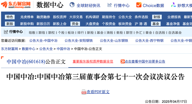 4月17日,中國冶金科工股份有限公司(以下簡稱“該公司”)發布兩篇公告,其中顯示,該公司於4月16日召開第三屆董事會第七十一次會議。