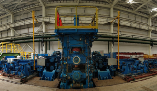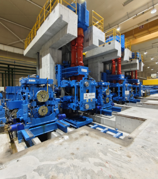 橫移可逆開坯機:憑借先進的設計理念和製造工藝,該裝備成為鈦合金加工領域的核心裝備。橫移式可逆開坯機采用軋線固定、軋機橫移的方式,特別適用於鈦合金軋製,采用全自動柔性匹配技術,實現橫移、拋鋼、翻鋼、對中以及軋件直線供給等多項功能,縮短道次間歇時間,優化速度控製,防止劃傷。