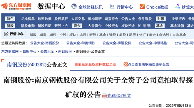 5月13日,南鋼股份發布公告稱,5月12日,該公司全資子公司安徽金安礦業有限公司(以下簡稱“金安礦業”)以92,036.77萬元人民幣競得安徽省霍邱縣範橋鐵礦勘探(探礦權保留)探礦權;同日,金安礦業與安徽省產權交易中心有限責任公司簽訂《競價結果通知單》。