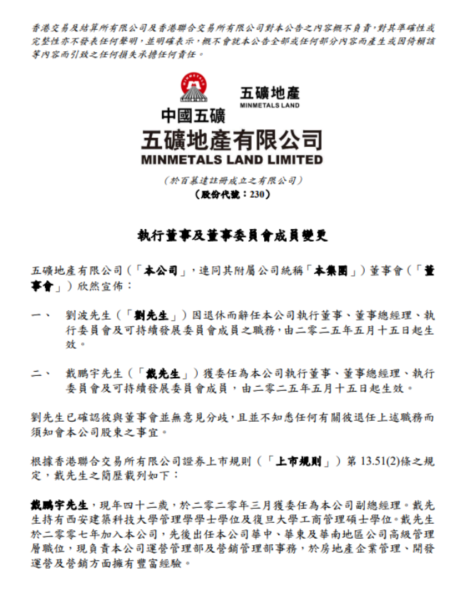 5月14日,五礦地產有限公司發布公告,宣布公司執行董事及董事會委員會成員發生變更。