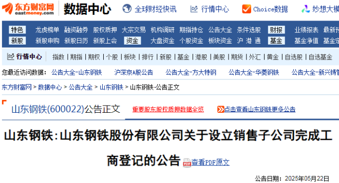 5月21日,山東鋼鐵發布了《山東鋼鐵股份有限公司關於設立銷售子公司完成工商登記的公告》。
