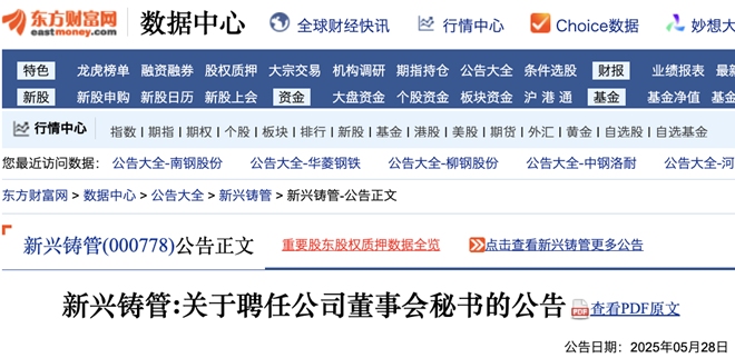 5月28日,新興鑄管股份有限公司(以下簡稱“該公司”)發布《新興鑄管股份有限公司關於聘任公司董事會秘書的公告》(以下簡稱《公告》)。