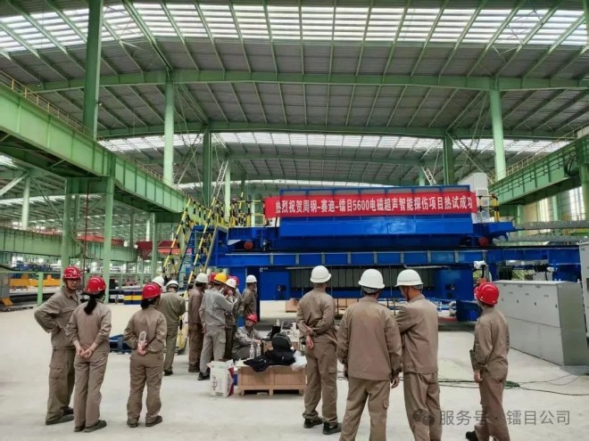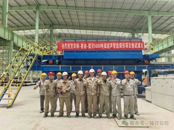 2025年5月20日,鐳目公司自主研發的電磁超聲中厚板智能探傷係統於河南安鋼周口鋼鐵有限責任公司(周鋼)的全球最寬5600毫米寬厚板生產線成功完成熱試,創造了全板麵“零漏檢、全準報”的卓越成績,刷新了行業紀錄,填補了國際技術空白。
