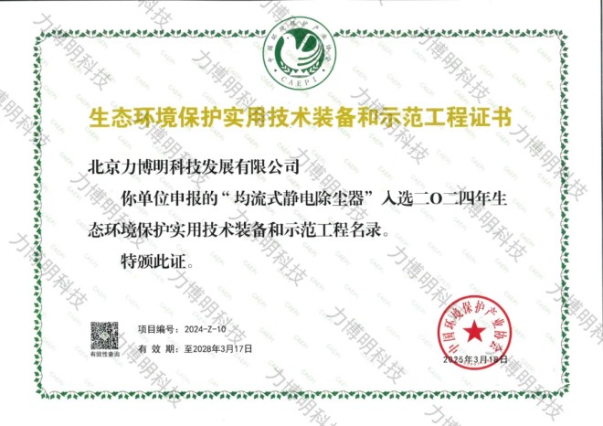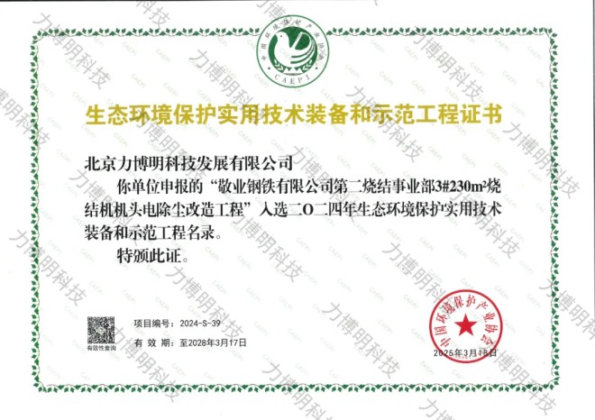 近日,北京力博明科技發展有限公司再傳捷報!力博明科技自主研發的發明專利技術——"均流式靜電除塵技術",於2025年5月21日正式被列入《國家汙染防治技術指導目錄》,並納入國家標準體係。與此同時,應用該技術的"敬業鋼鐵有限公司第二燒結事業部3#230㎡燒結機機頭電除塵改造工程”項目成功入選2024nianshengtaihuanjingbaohushiyongjishuzhuangbeiheshifangongchengminglu,chengweixingyelvsefazhanbiaogan。biaozhizhelibomingkejizaihuanbaojishuchuangxinyugongchengshijianlingyuzaicihuodeguojiajiquanweirenke!